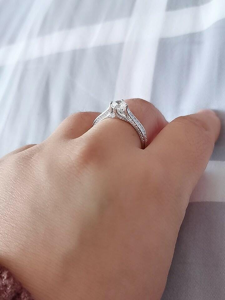 - Elegant Setting: A timeless four-prong head sits atop a graceful "cathedral" setting, where the band sweeps upwards to present the center stone.