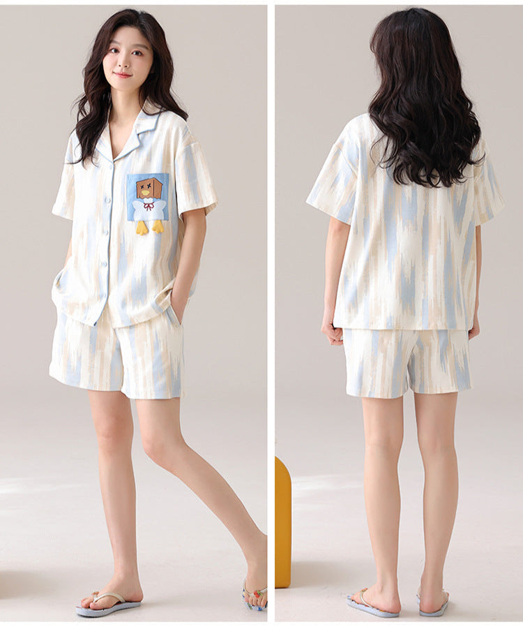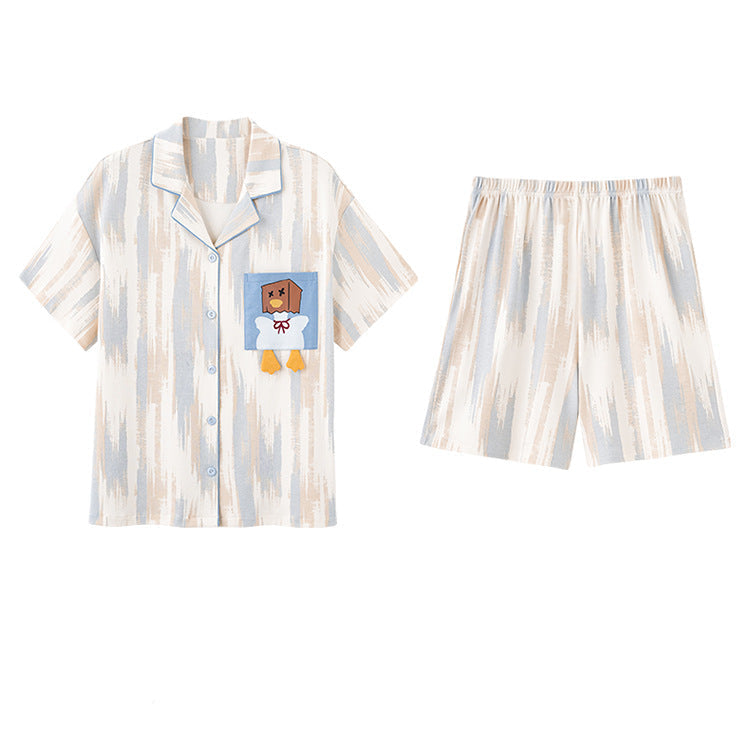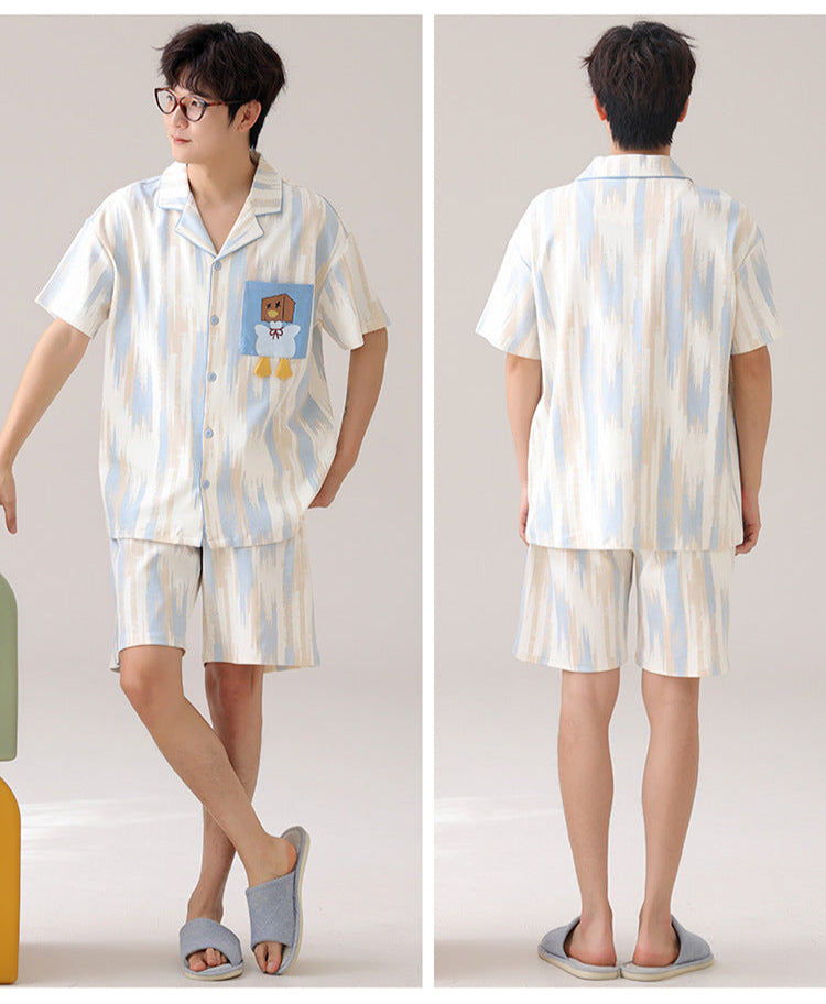 Cute Cartoon Couple Pajamas - Cotton Short Sleeve Cardigan Set