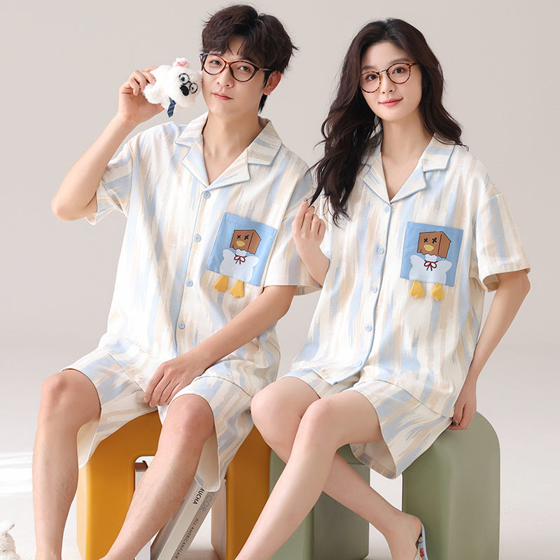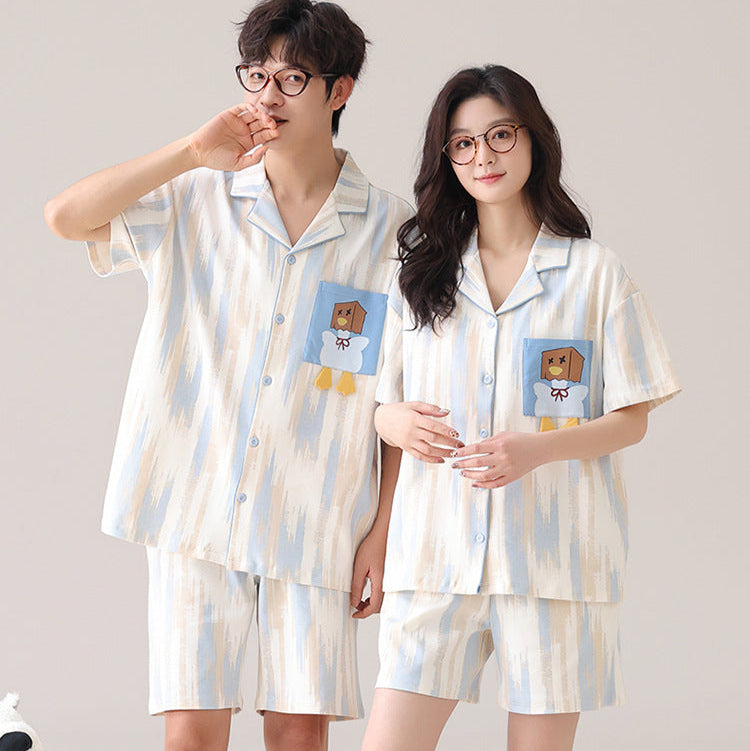 Cute Cartoon Couple Pajamas - Cotton Short Sleeve Cardigan