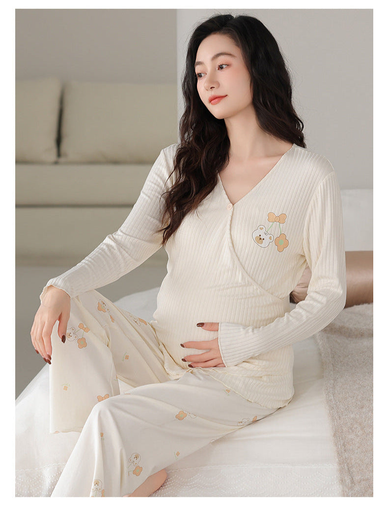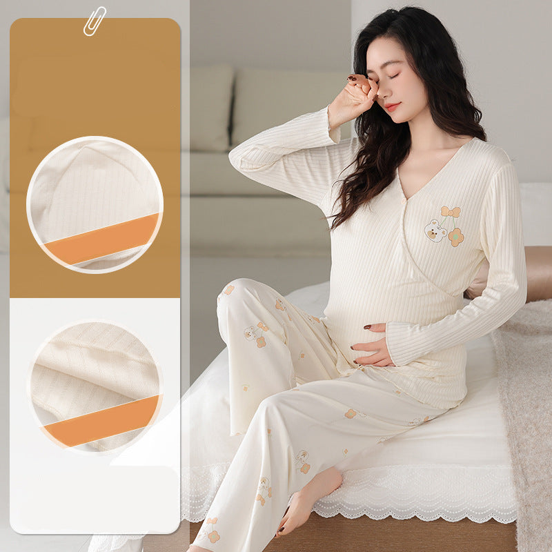 Absolutely. This 2-piece set offers convenient nursing access. The ribbed wrap-front top allows for effortless feeding, making it a perfect nursing pajama set. Furthermore, the long pant with cuffs comes with an adjustable waistband, effortlessly adapting to your changing body shape throughout pregnancy and postpartum, ensuring a relaxed fit that's always supportive and comfortable.