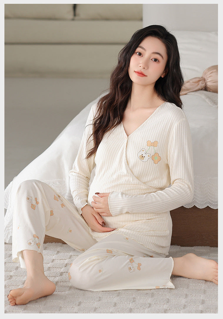 Yes! This maternity sleepwear lounge set with nursing access embodies a casual chic style, featuring a soft beige base adorned with a charming cartoon print that creates a warm, whimsical, and inviting home ambiance. It's perfect for everyday lounging and creating a serene sanctuary. Beyond home, it's an elegant solution for sudden appointments, casual coffee runs, or comfortable travel, allowing seamless transition from rest to ready, making it an indispensable maternity lounge set for your dynamic lifestyle.