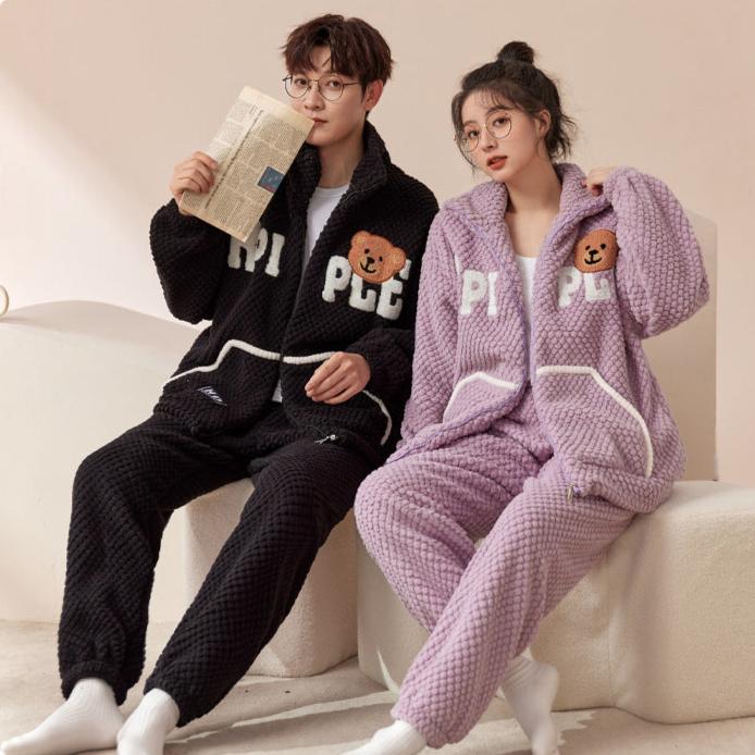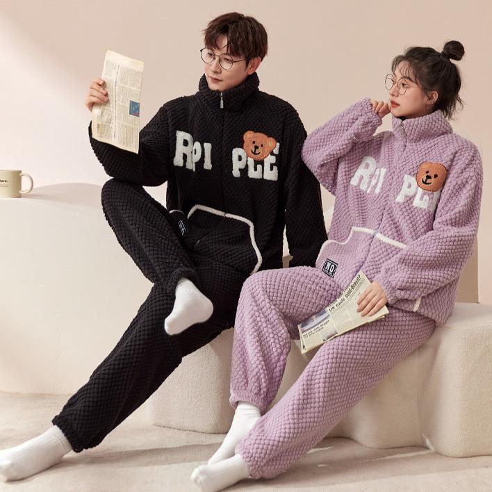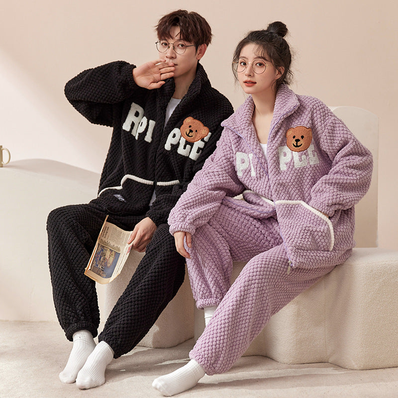 4-Piece Bear Winter Thick Flannel Couples Pajamas Set - Cozy Warmth, Adorable Style