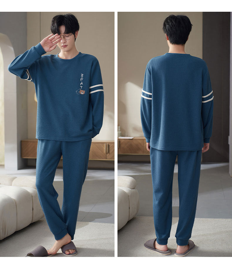 Snuggle up in adorable style with our Beary Cozy Matching Couple Pajamas! Perfect for year-round comfort, these regular-fit pjs are crafted from a soft and breathable blend of 35% cotton and 65% polyester. His set features a textured teal blue long-sleeved pullover with a charming bear graphic on the chest, while hers boasts a delightful "bear family" design on a textured off-white top.