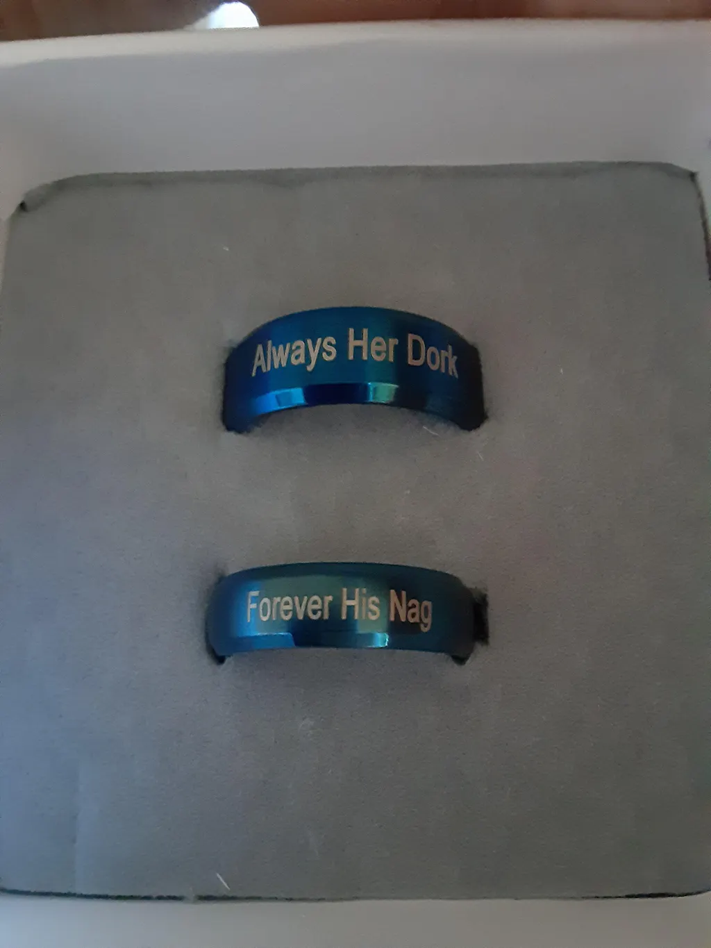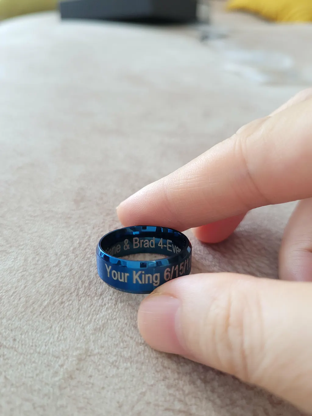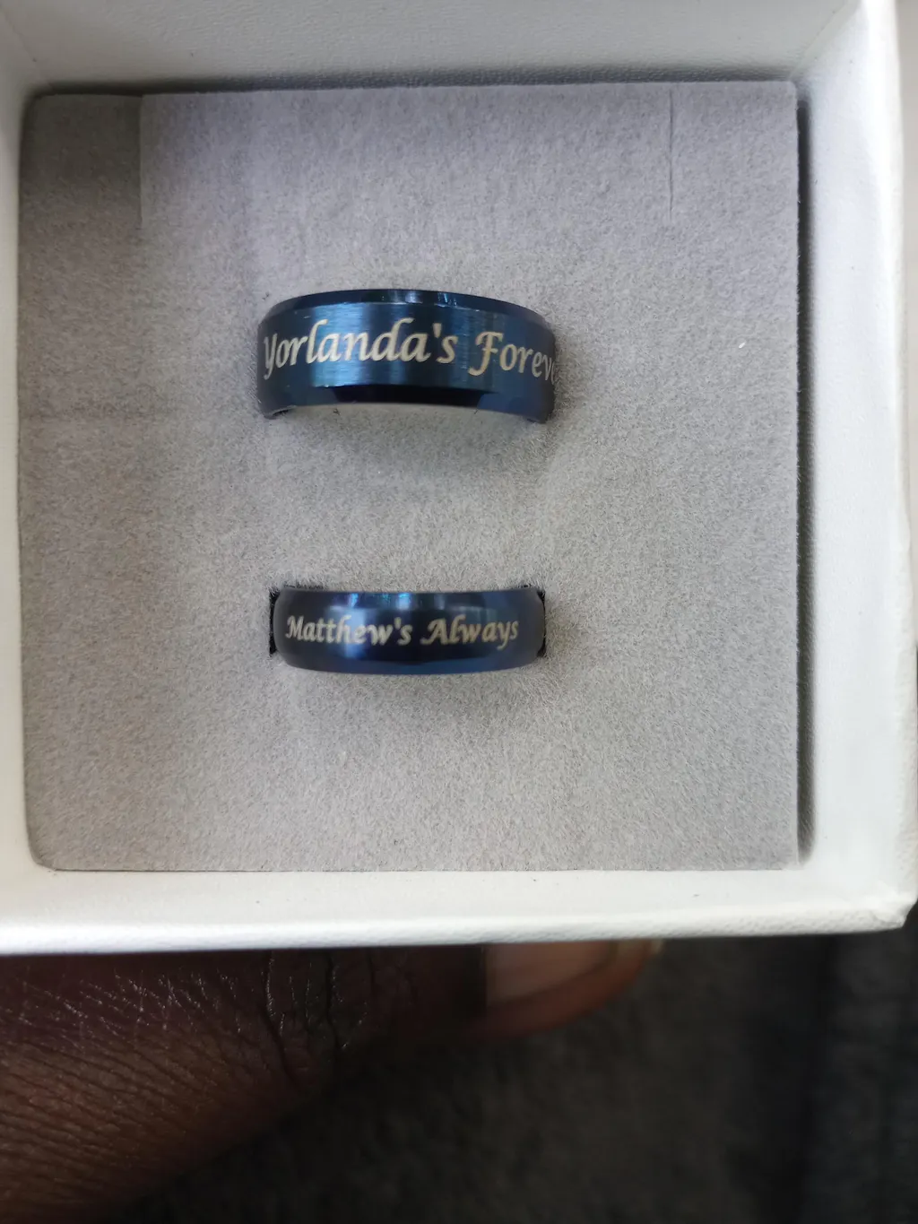 For a love that's bold, brilliant, and one-of-a-kind. This stunning set of matching promise rings is crafted to make a statement, featuring a captivating, deep blue finish and your personal message engraved for the world to see. It’s a modern, powerful symbol of your unwavering commitment, designed to be as durable and lasting as your bond.