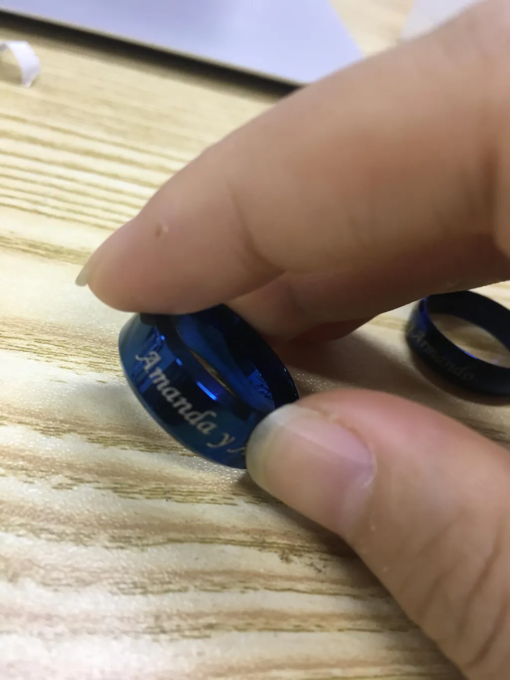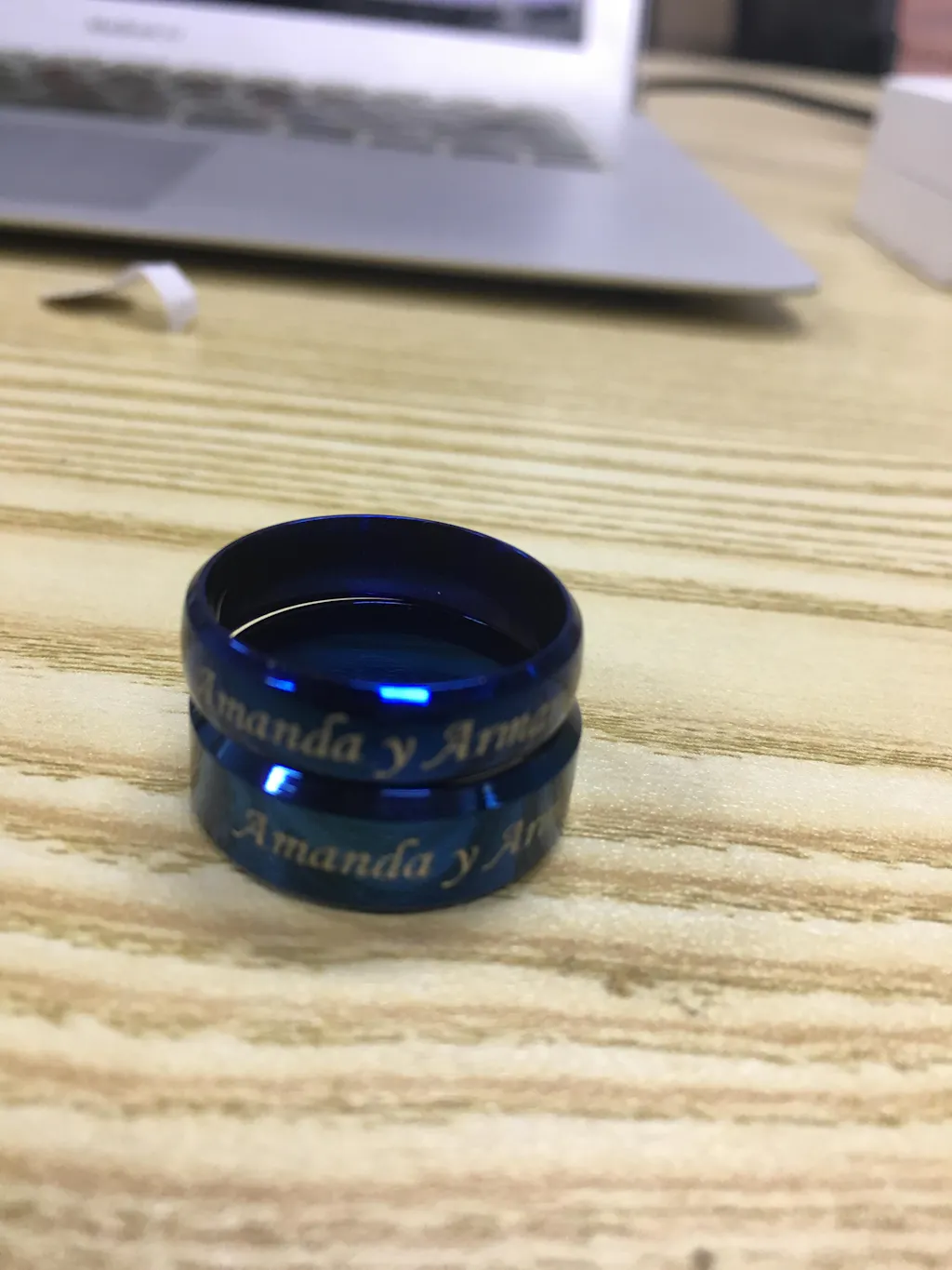 Make your commitment known. Order your personalized blue titanium ring set today.