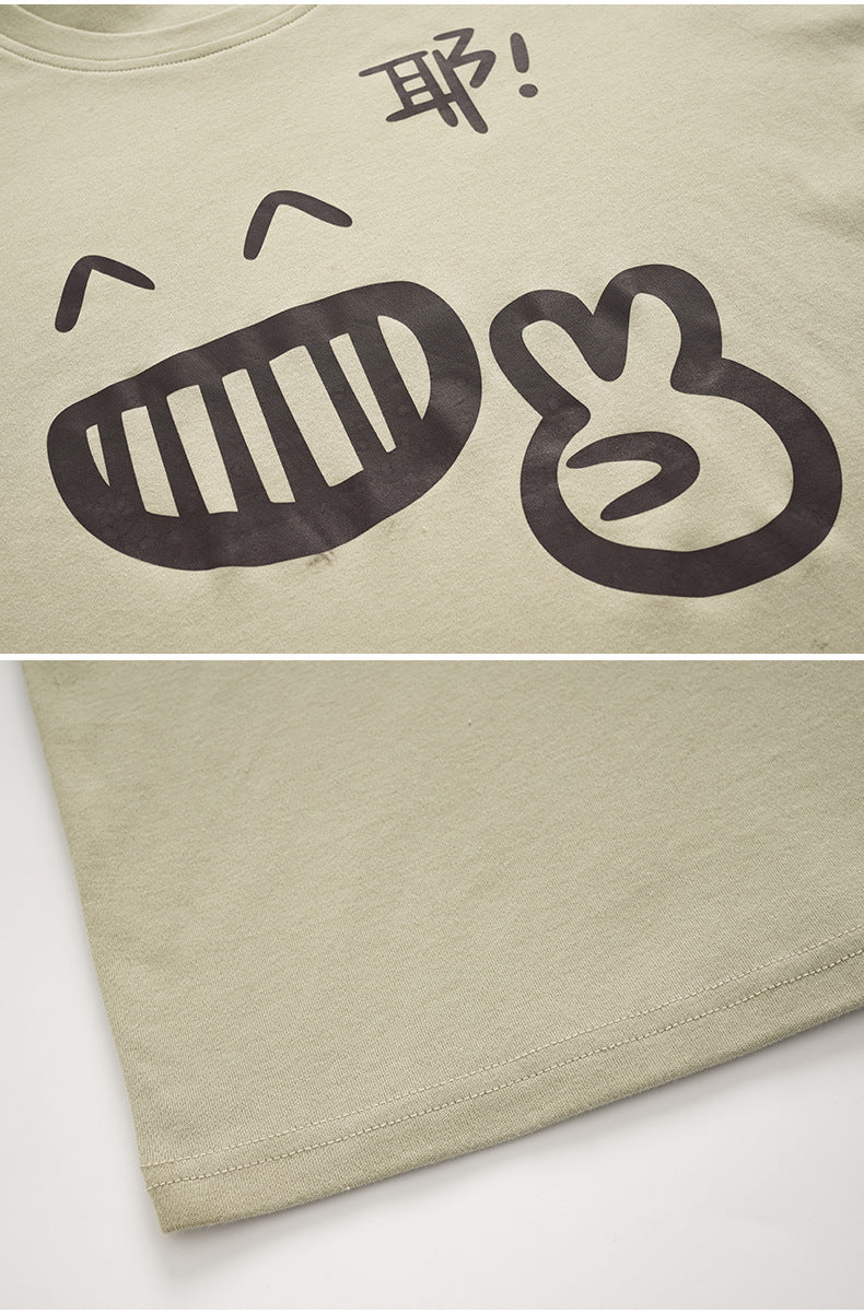 A: This set features a cool and playful emoticon-style graphic that expresses a cheerful, carefree mood. It’s a minimalist and trendy design for couples who appreciate fun, modern art.