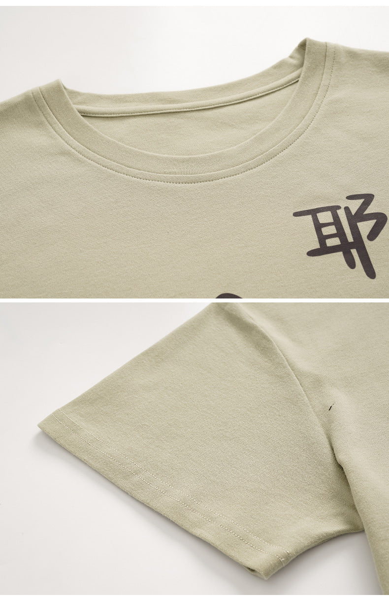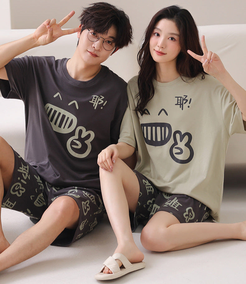 A: It’s a stylish inverse design. He wears a charcoal tee with khaki graphics, while she wears a khaki tee with charcoal graphics. You both wear the same patterned shorts, creating a smart, harmonious look that’s coordinated but not completely identical.