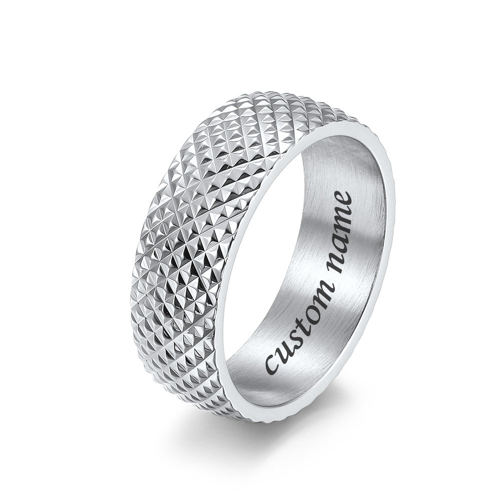 This stylish Engraved Lozenge Promise Ring for Men is made of stainless steel and is 8mm wide, perfect for making a statement. An elegant way to honor any special promise.