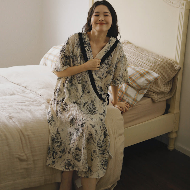Absolutely. This blouse is designed with a classic Oriental black and white ink wash print, exuding timeless elegance. Its convenient side-tie design is specifically created for effortless breastfeeding during the nursing period, ensuring quick and private feeding sessions without compromising your style or comfort. This makes it a perfect nursing pajama top for discreet and stylish breastfeeding pajamas, blending beauty with essential functionality.