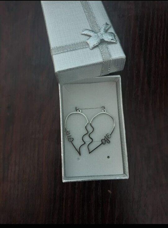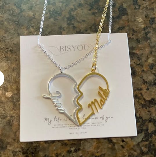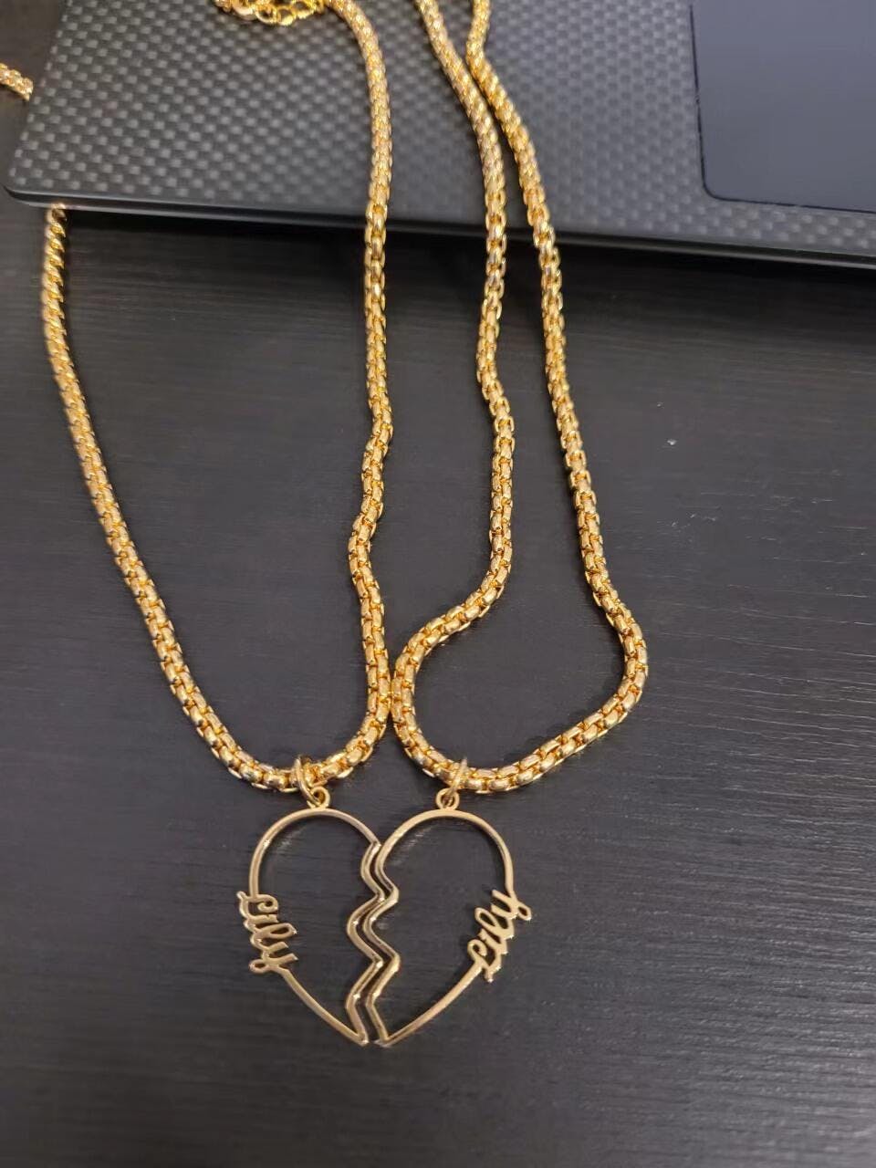 - Design: Two seamless interlocking half-heart pendants with custom cut-out names (script font, vertical orientation)