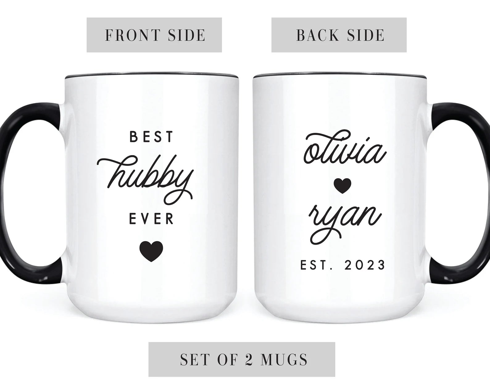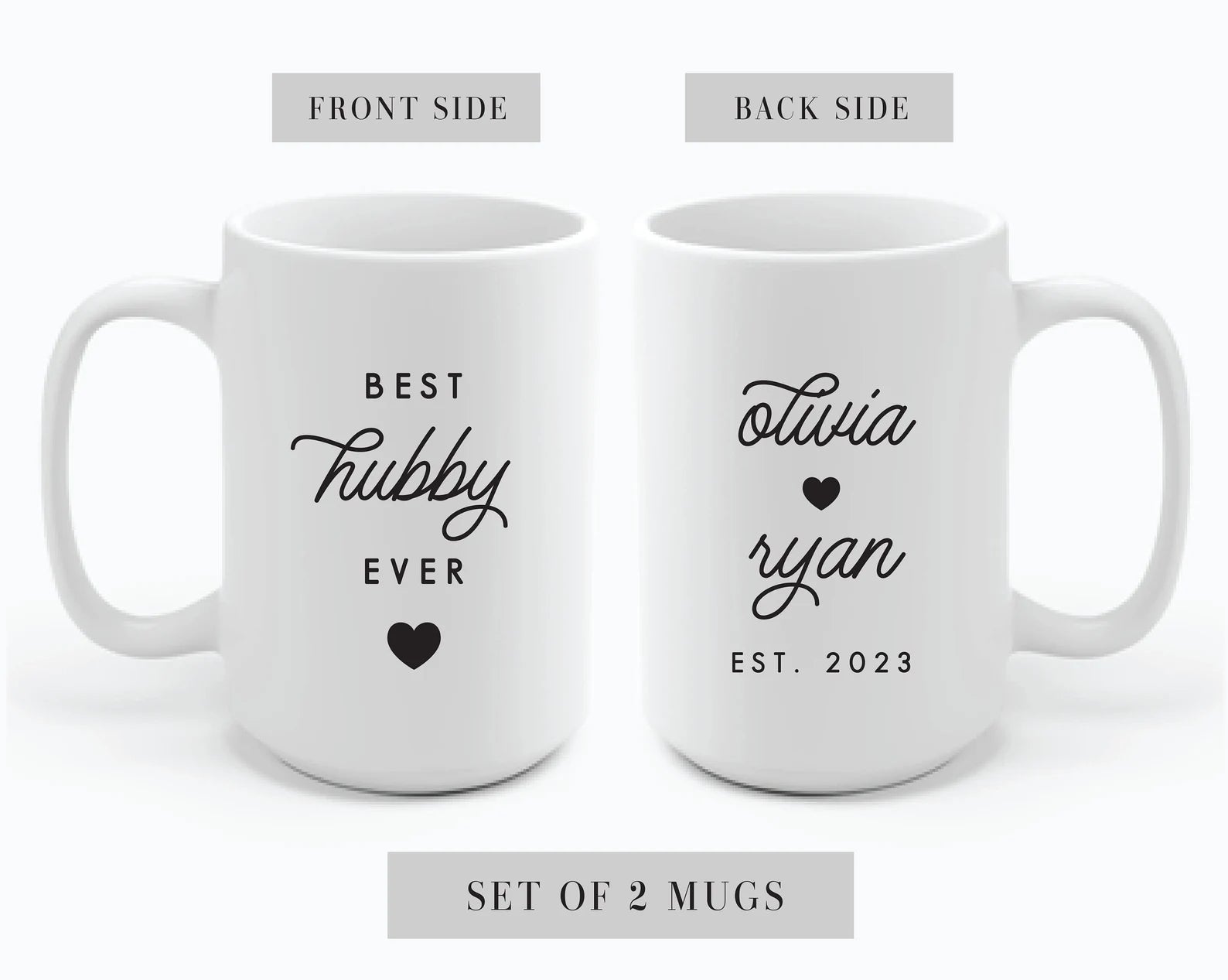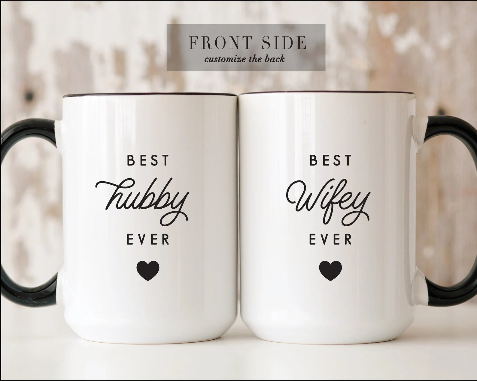 Celebrate your love story with this set of personalized hubby and wifey mugs!