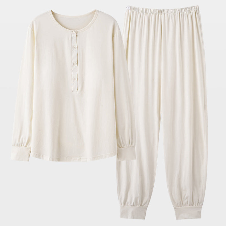 This long sleeve maternity sleepwear set is specifically designed to provide that extra layer of warmth and comfort. Its thoughtful cuffed design at wrists and ankles provides crucial protection from drafts and chills, ensuring cozy serenity and undisturbed comfort and warmth in any environment. This feature is integrated seamlessly into the minimalist, modern cuffed design, providing warmth without adding bulk, making it a truly exceptional maternity sleepwear choice.