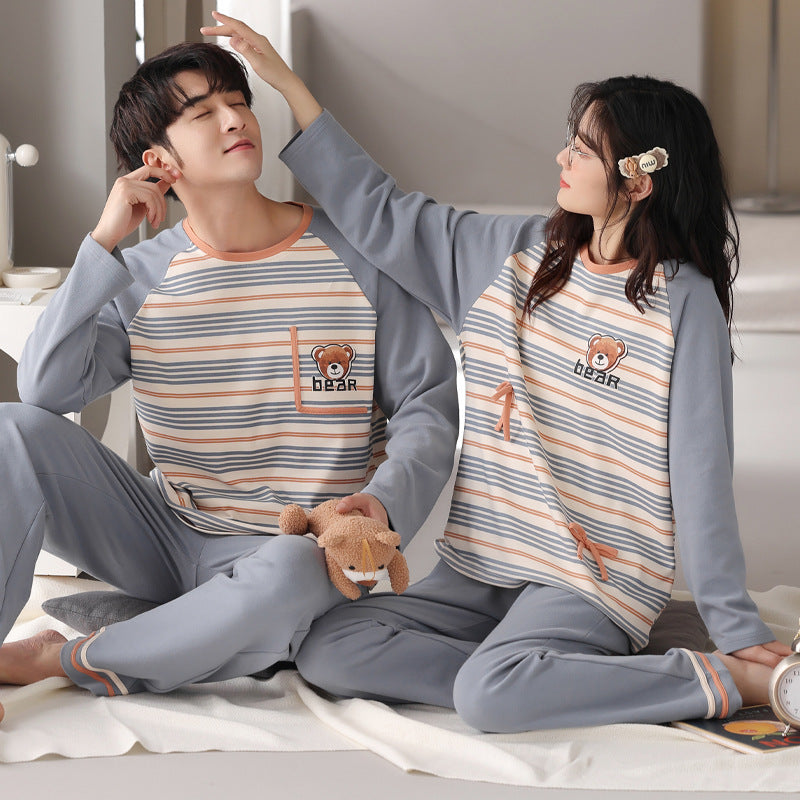 Absolutely! This Matching Bear Couple PJs and Loungewear Set adds a touch of charm and shared style to your nights in. Our Matching Bear Design subtly shows your love with minimalist pinstripe pajamas featuring a charming bear motif. It's the ideal matching set for couples to enhance your bond and create memorable moments, perfect for Valentine's Day, Christmas, or Anniversaries.
