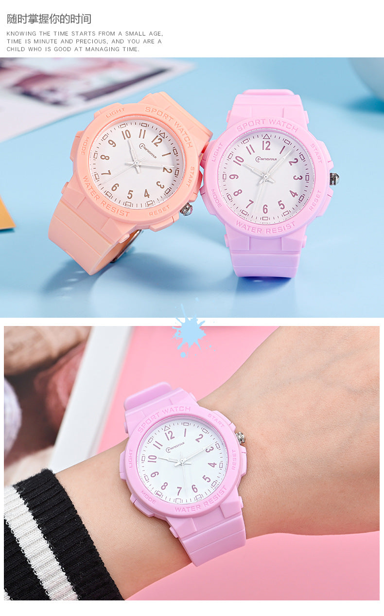 The watch features include luminous display, stopwatch function, alarm mode, hourly chime, and weekly calendar.