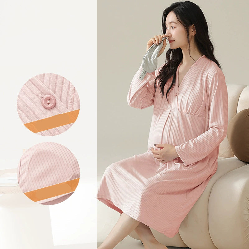 Absolutely. This maternity nightgown is thoughtfully designed for maximum convenience and confident modesty. Its thoughtful front design ensures convenient and discreet nursing access whenever needed. Plus, an innovative integrated bra shelf with removable pad pockets offers built-in light support, eliminating the need for a separate bra, and thoughtfully helps prevent milk leakage and nipple show-through embarrassment, making it an essential piece of your maternity nursing pajamas collection, ensuring unparalleled comfort and a worry-free experience for your motherhood journey.