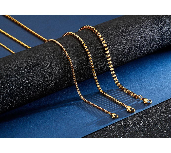 This anti-rust and anti-allergic highest quality stainless steel men's box chain necklace features multiple thickness and lengths for a chain and is available in an elegant silver and gold tone. It will be shipped in an exquisite gift box and a gift card which makes it a perfect birthday, anniversary, valentines or christmas gift for men.