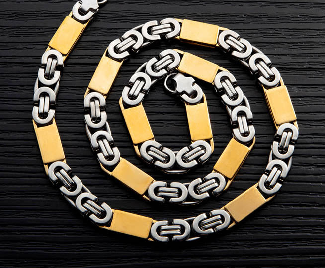 This anti-rust and anti-allergic highest quality stainless steel men's Byzantine flat chain necklace features 8.3mm thickness and 55cm length for a chain and is available in an elegant silver/gold mix tone. It will be shipped in an exquisite gift box and a gift card which makes it a perfect birthday, anniversary, valentines or christmas gift for men.
