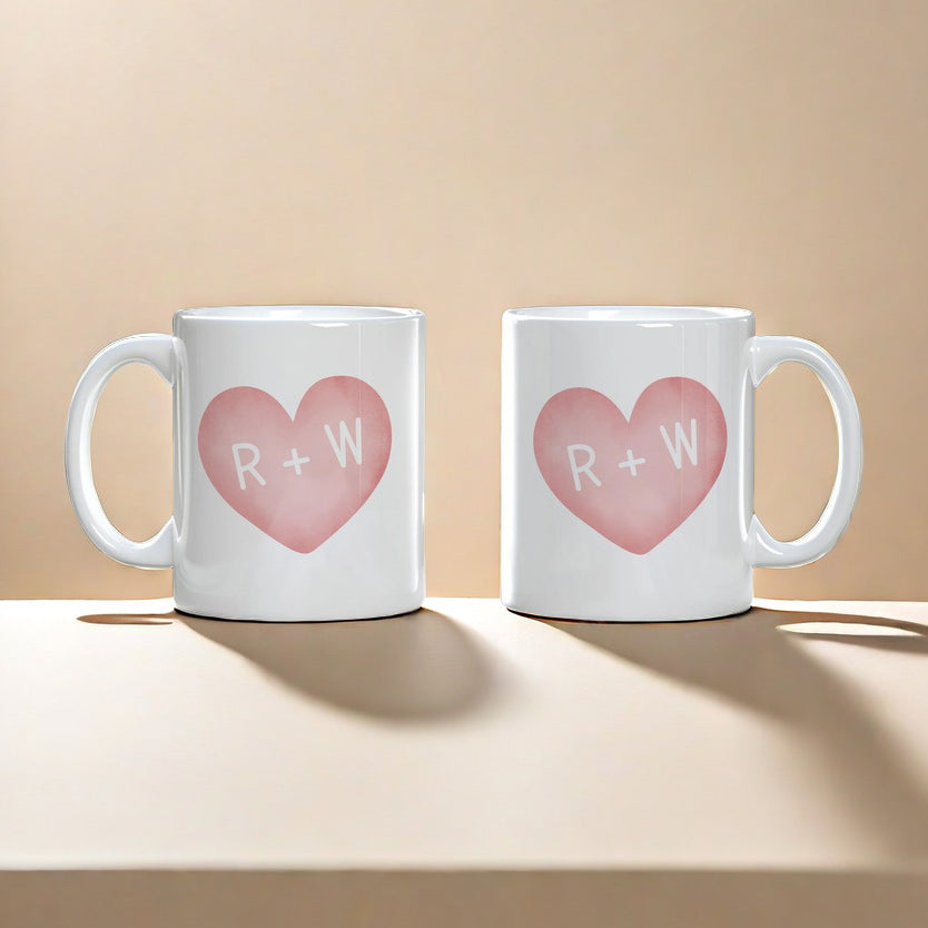 Celebrate your love story with this set of personalized heart mugs featuring your initials!