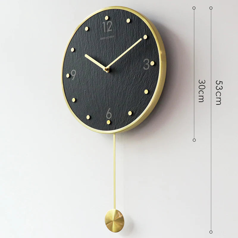 - Brass/copper details (hands, trim, pendulum) for a warm contrast on the stone face.