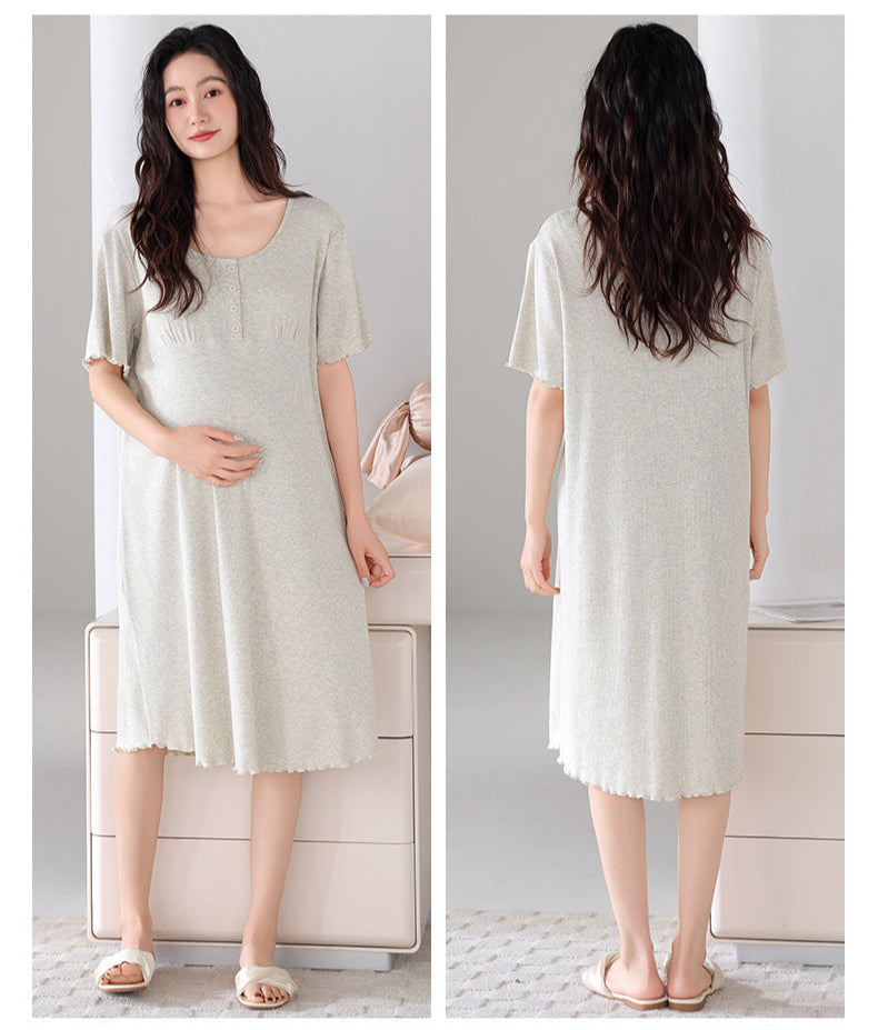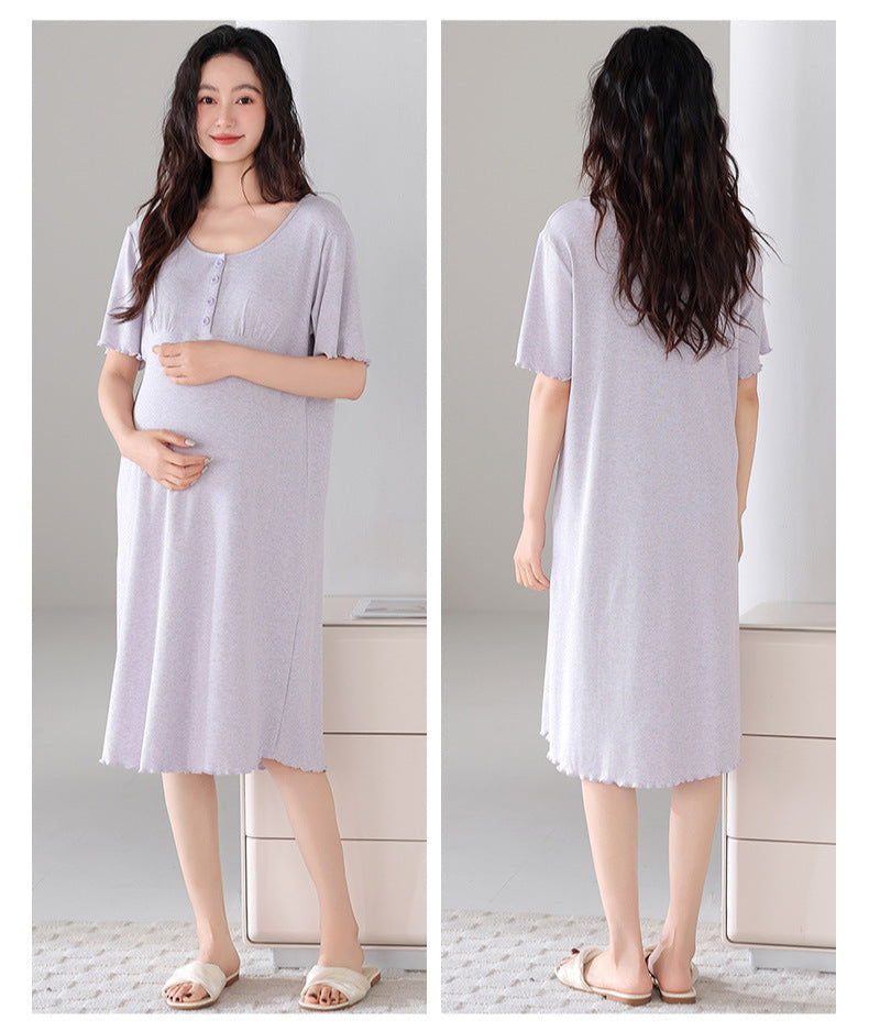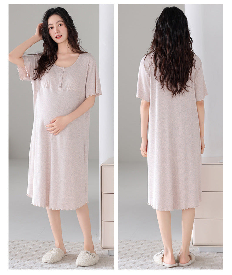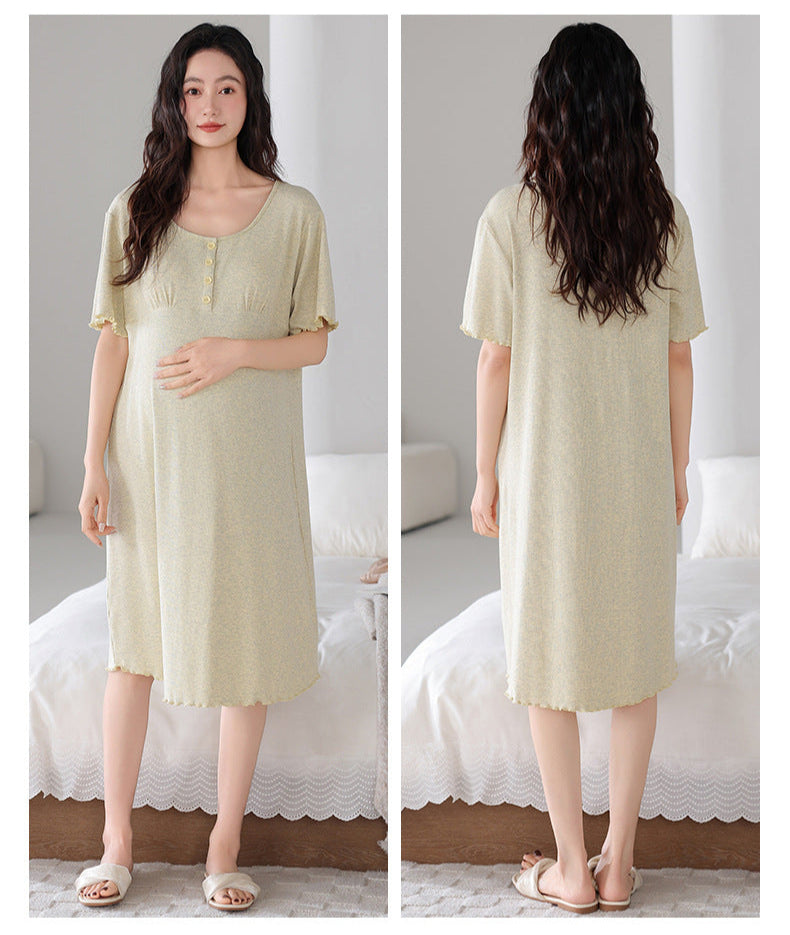 Yes! This maternity sleepwear piece embodies a minimalist, modern cuffed design in a solid color. With its versatile Day-to-Night Style, this midi length (over-knee to mid-calf) dress beautifully blurs the lines between cozy sleepwear and chic casual wear. It's perfect for both restful nights and stylish daytime activities, offering an elegant solution for sudden appointments, casual coffee runs, or comfortable travel. This makes it an ideal maternity lounge set for chic & quick ventures.