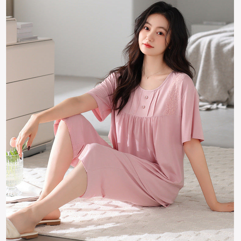 This versatile 2-piece pajama set, which includes 1 top and 1 shorts, features a minimalist solid color style. It's the perfect selection for serene summer nights at home, relaxing after a long day, or as a thoughtful birthday gift for any woman seeking superior comfort and peace of mind.