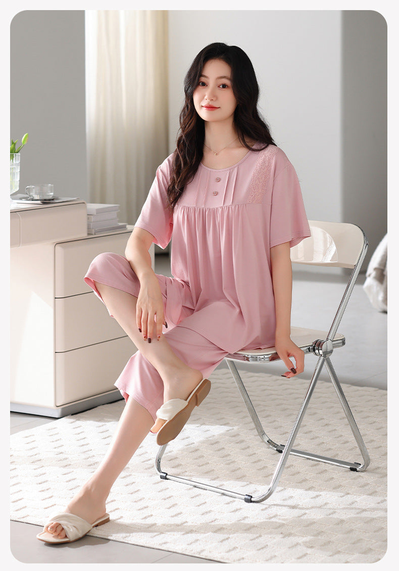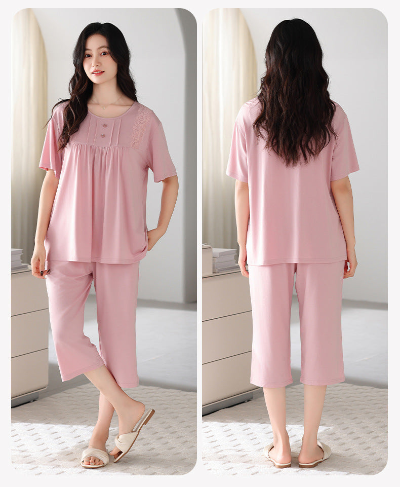 Never! Engineered with a regular fit and natural stretch from the Modal and Spandex, this set guarantees complete freedom of movement. The short-sleeve pullover top and comfortable Capri pants are expertly tailored to flow with your body, ensuring you can lounge and sleep without any twisting, riding up, or restrictive tightness. Experience genuine, uninhibited comfort.