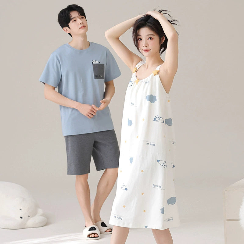 A: This set is your perfect solution. It was specifically created for couples with different style preferences, offering a T-shirt and shorts for him and a nightgown for her. The shared color palette and charming panda theme ensure you look beautifully coordinated without sacrificing personal comfort.