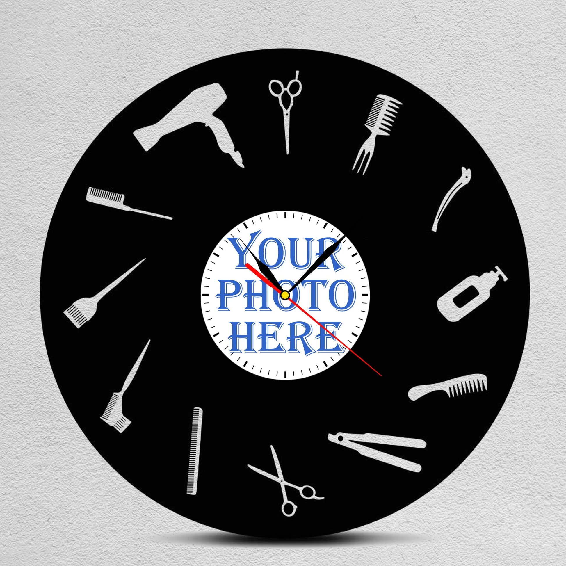 Celebrate your barber shop with the Gullei Personalized Barbershop Wall Clock. Made from a genuine LP record, this unique clock combines functionality and style with a custom touch. Perfect for any barber, groomsman, or barber shop owner, it features silent quartz movement for a peaceful environment while showcasing your personalized photo and text. A great addition to any grooming space, this clock makes a memorable gift for those who appreciate style and craftsmanship.