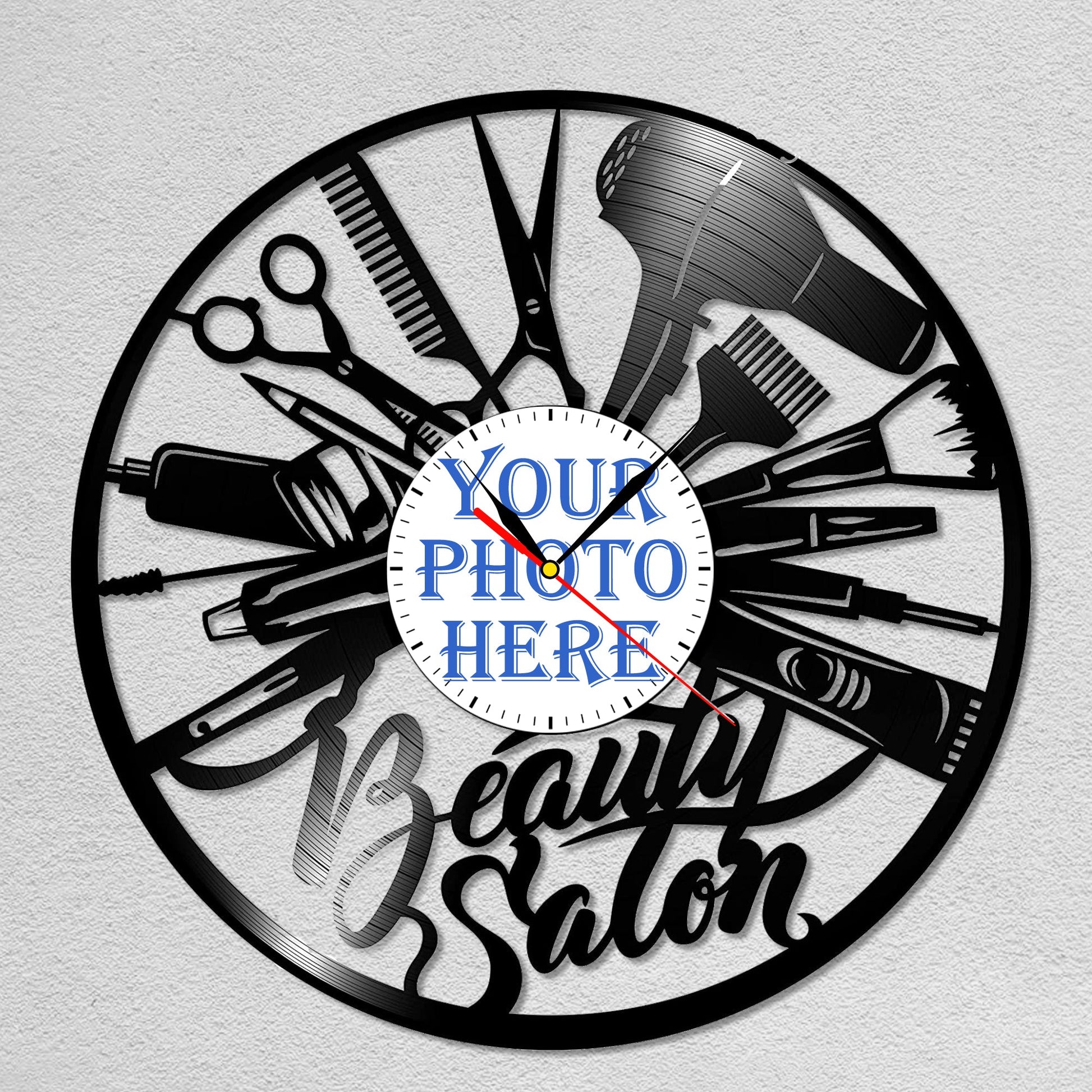 Personalized Beauty Salon LP Record Wall Clock – Custom Photo & Name, Silent Quartz