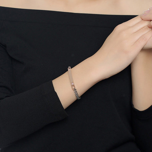 - Stylish His and Hers Design: One bracelet features a sophisticated gold-plated rectangular plate with a single pink cubic zirconia. The other offers a sleek black enamel-plated rectangular plate with a single blue cubic zirconia.