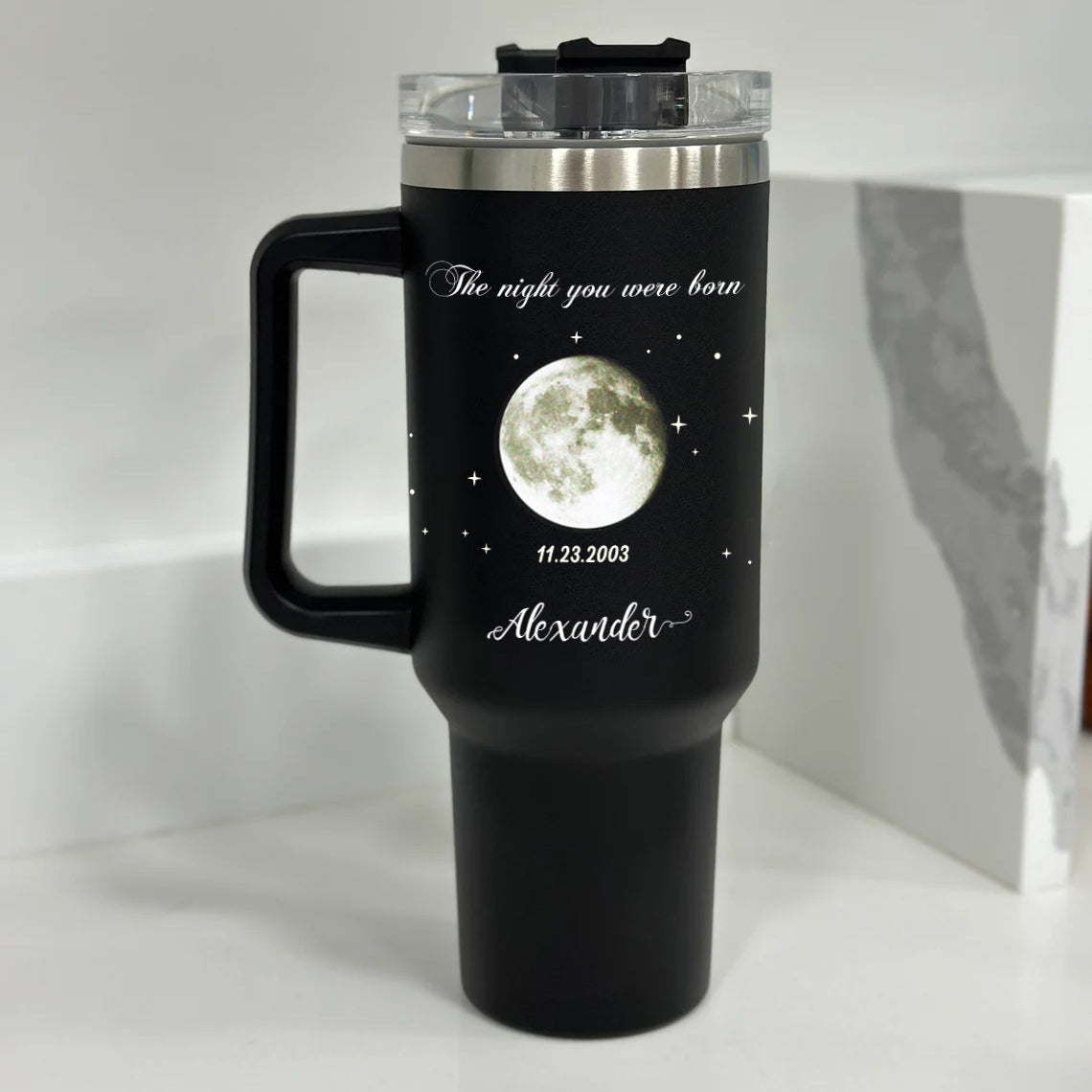 - A Touch of Destiny: This 40-ounce stainless steel tumbler showcases a personalized moon phase representing a special date, along with his name, creating a unique and meaningful keepsake.