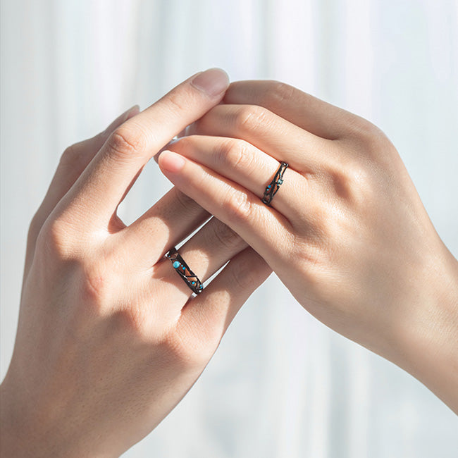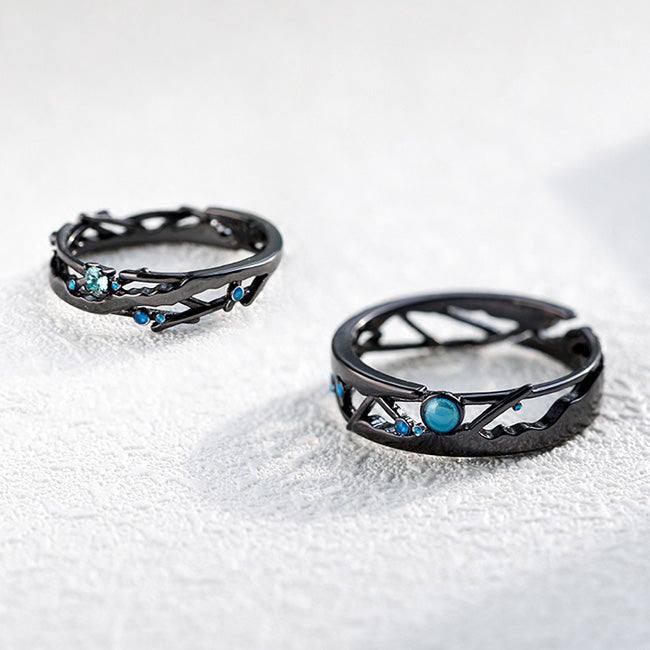 Hey there, cosmic couple! Ready to symbolize your infinite and ever-growing love in a truly unique way? The Celestial Embrace ring set isn't just a pair of striking black bands; it's a representation of your boundless connection, as vast and mysterious as the night sky.