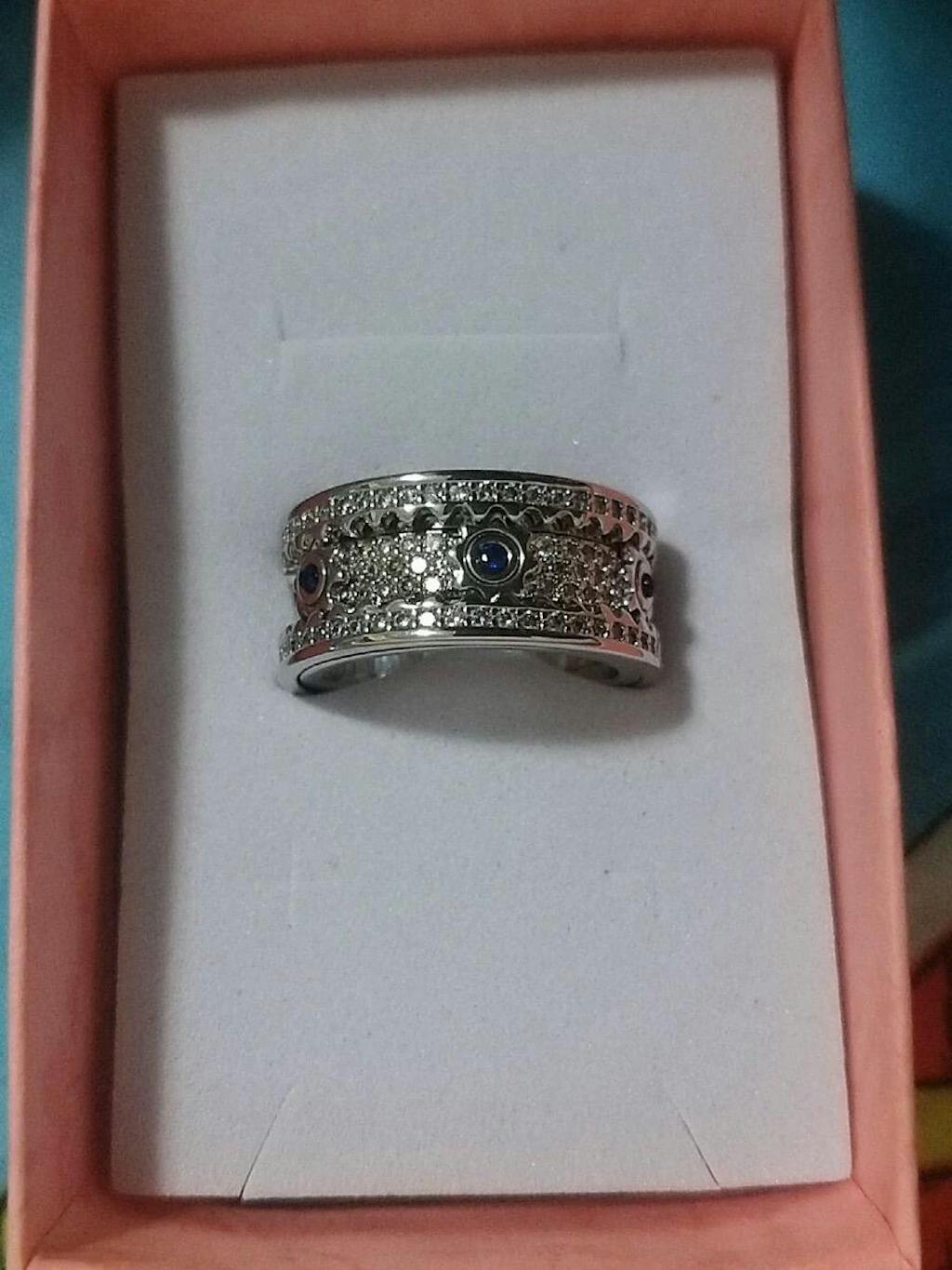 The design is absolutely incredible, blending a unique gear and cog aesthetic with dazzling sparkle. The amount of shine from the tiny stones is amazing—the brilliance really catches the light. It's a wide band that feels substantial and high-quality.
