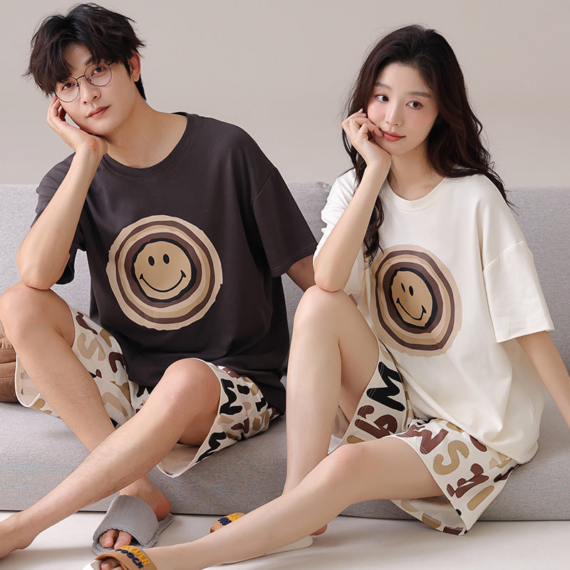 Put on a happy face. This pajama set is your daily dose of positivity, designed to bring a smile to your downtime. Featuring a large, stylized smiley face graphic with a cool, retro-modern vibe, it’s a cheerful statement piece for any couple. The clever "his and hers" inverse color scheme and patterned shorts create a perfectly coordinated look. Crafted from 100% pure cotton, this set wraps you in natural, breathable comfort, ensuring you feel as good as you look.