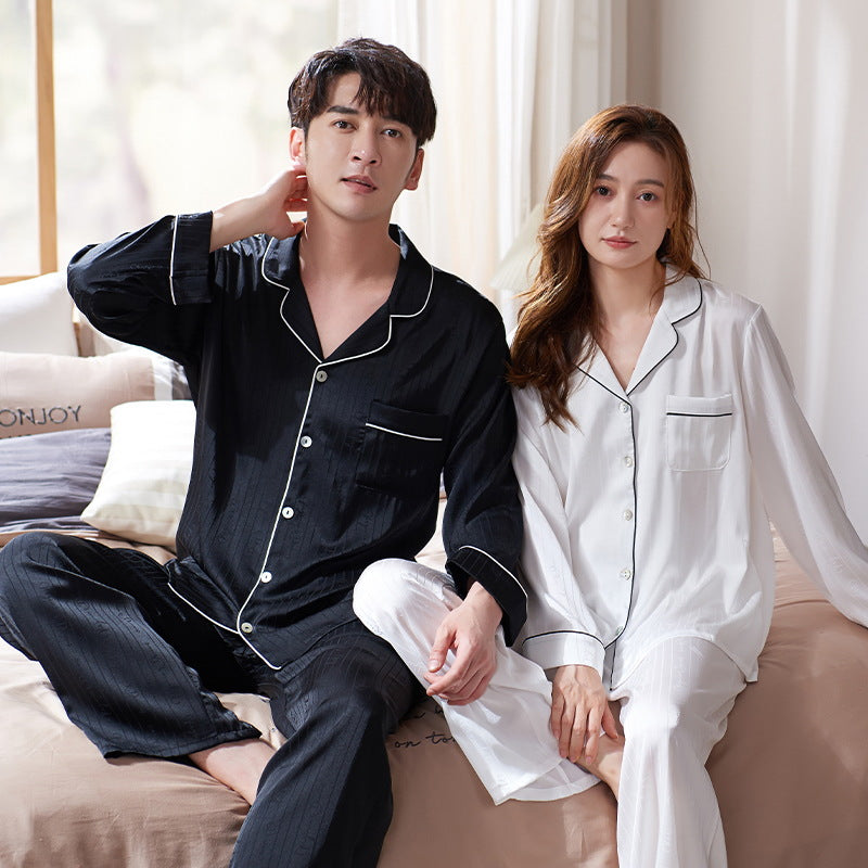 Embrace refined comfort with our Sleek Slumber Modern Minimalist Couple Pajamas. Perfect for year-round relaxation, these regular-fit pjs are crafted from smooth 95% polyester, offering a gentle and comfortable feel. The modern design features a classic long-sleeved, button-down top and matching long pants, elevated by stylish contrasting piping – white on black for him, and black on white for her.