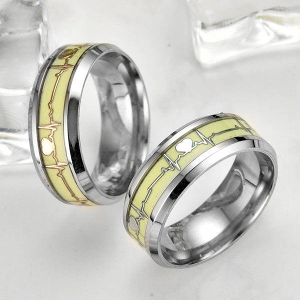 Luminous Heartbeat Promise Rings Set, Engraved Glow-in-the-Dark Matching Rings