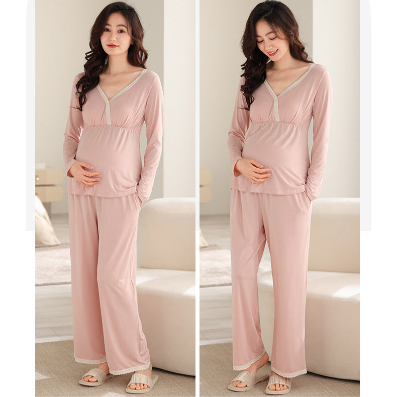 Absolutely. This V-Neck Maternity Sleepwear embodies a minimalist style while being enhanced with delicate white lace detailing on the V-neckline and pant legs. This thoughtful addition lends a timeless, sophisticated style that adds elegant charm to your maternity wardrobe. Its solid color and clean lines create a refined aesthetic that's perfect for both cozy home wear and presenting yourself with poise for various occasions.