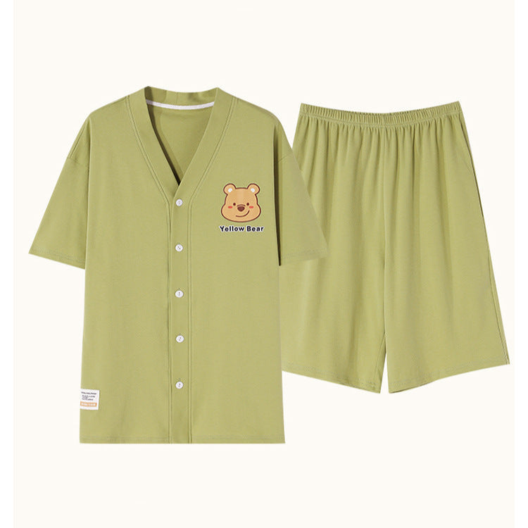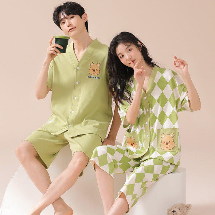 Elevate your casual comfort. This charming couple's set trades the traditional tee for a stylish V-neck cardigan, creating a look that’s effortlessly polished and playfully preppy. His solid green set perfectly complements her vibrant diamond-print ensemble, with a cute "Yellow Bear" patch tying the two styles together. Crafted from incredibly soft and stretchy Lycra Cotton, this set offers a more structured, fashionable way to relax in perfect comfort.